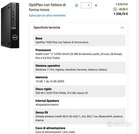 Vendo mini PC Dell OptiPlex 7020 Plus Micro, ultra compatto e potente, ideale per lavoro, ufficio, smart working, programmazione e utilizzo intensivo.