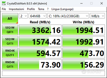 PC dalle ridottissime dimensioni ma di potenza elevata (Intel Core i5 di 7th gen con 4 cores/4 threads e 65W di TDP). L'SSD M.2 NMVe Western Digital (nuovo solo ore di installazione: v. immagine) offre prestazioni superiori, minore latenza, migliore efficienza energetica e una maggiore capacità di gestione delle operazioni di I/O rispetto alla tradizionale tecnologia SSD SATA (v. immagine con i valori di lettura/scrittura). All'interno e' inoltre disponibile un adattatore per ospitare un ulteriore HDD/SSD SATA da 2.5". E' il modello a 65W per cui e' possibile installare tutte le CPU Intel di 7th gen anche a 65W di TDP. MARCA: HP MODELLO: EliteDesk 800 G3 65W CASE: Micro DIMENSIONI: 17,7 x 17,5 x 3,42 (l x p x a) PROCESSORE: Intel Core i5-7500 @3.40 GHz TDP 65W RAM: 8GB DDR4 PC4-2666 STORAGE: SSD M.2 NVMe Western Digital SN740 256GB PCIe 4.0 (x4) LETTORE OTTICO: N/D SCHEDA VIDEO: INTEL HD 630 GRAPHICS PORTE E SPECIFICHE: Fronte: 1 USB 3.1 Type-C™ (ricarica); 1 USB 3.1 Gen 1; 1 USB 3.1 Gen 1 (ricarica); 1 connettore per cuffie; jack audio universale con supporto per cuffie CTIA; Retro: 4 USB 3.1 Gen 1; 1 RJ-45; 1 connettore di alimentazione; 3 DisplayPort™ 1.2 SISTEMA OPERATIVO: MS Windows 11 PRO 24H2 Il dispositivo e' dotato del suo alimentatore HP originale. Dispositivo usato, pronto all'utilizzo. No perditempo, solo se veramente interessati. Contatto via WhatsApp al numero scambiato via chat Subito.it. Ritiro in zona: Bologna/Casalecchio. In alternativa spedizione con TuttoSubito. Compravendita fra privati: l'oggetto viene venduto visto e piaciuto con esclusione di ogni garanzia eccezion fatta per dolo o malafede del venditore. HP EliteDesk minipc tiny Thin