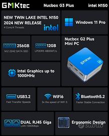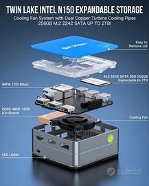 【12 GB DDR5 RAM, 256 GB SSD mini computer】Il mini PC GMKtec dispone di memoria DDR5 con una velocità massima di 4800 MT/s e un SSD M.2 2242 integrato da 512 GB. Questo mini desktop offre tempi di avvio più rapidi, multitasking efficiente e trasferimenti di file rapidi.