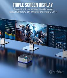 Display 4K triplo schermo: il mini computer desktop G2 Plus è dotato di Intel Graphics (max. 1000 MHz), supporta la riproduzione video 4K e la decodifica AV1. Collega il PC a un proiettore come home theater e goditi un'ampia gamma di opzioni di intrattenimento. Due porte HDMI 2.0 e una porta DP V1.4 consentono un multitasking efficiente su tre display 4K@60Hz.