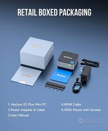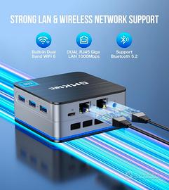 Molteplici porte e connessioni rapide: il mini computer Nucbox G2 è dotato di 3 porte USB 3.2 (fino a 5 Gbps), 2 porte HDMI (4K a 60Hz) e un jack audio da 3,5 mm. Supporta WiFi 6, Dual Gigabit Ethernet (RJ45 1000M) e Bluetooth 5.2. Questo mini PC consente di collegare più dispositivi e può essere utilizzato con server, sistemi di sorveglianza, apparecchiature per ufficio, display, proiettori, televisori e altro ancora.