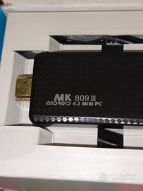 ModelloMK809 IIIProcessoreRockchip RK3188 Quad Core da 1.8 Ghz (Cortex A9)Scheda GraficaMali 400 quad coreRam2 GBMemoria Interna8 GBEspansione Memoriasi, fino a 32 Gb via microSDWireless802.11b/g/nBluetoothsi, 2.0 con EDRPorte USB1 USB 2.0 Host e1 mini USB 2.0 OTGuscita video1 HDMI 1.3Dimensioni132,59×65,28×6,18 mmPeso32 grSistema OperativoAndroid 4.2.1 Jelly Beancolorenero