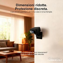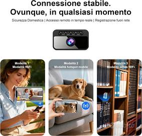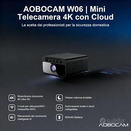 Mini Telecamera WiFi Interna 4K UHD Videocamera Sorveglianza con Visione Notturna, 5 Ore Autonomia, Notifiche Movimento Istantanee, Doppia Memoria SD/Cloud, Controllo Remoto Con App