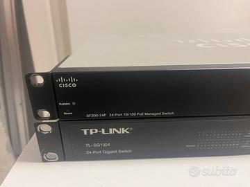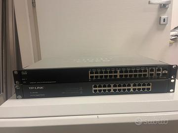 Vendo come da foto mobile rack da parete + 2 switch: -1 switch Cisco 24 porte PoE -1 switch TP-Link 24 porte Vendo preferibilmente in blocco.