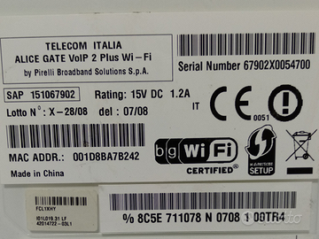 Modem ADSL2+ Ethernet / USB TELECOM ITALIA Modem Alice con interfacce Ethernet /USB con cavi di collegamento e filtro ADSL.