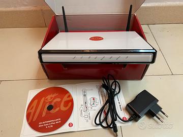 Modem Alice Gate 2 Plus Wi-Fi, completo con scatola originale, CD di installazione e cavo alimentazione. Modem ADSL2+ Ethernet/USB/Wi-Fi.
