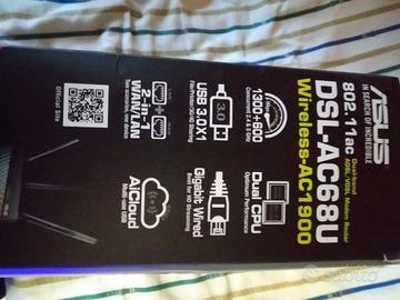 L'ASUS DSL-AC68U è un modem router dual-band ADSL/VDSL (compatibile con FTTC/FTTS), ideale per connessioni fino a 100 Mbps. Offre Wi-Fi AC1900 con velocità combinate fino a 1900 Mbps (600 Mbps su 2.4GHz + 1300 Mbps su 5GHz), supportando fino a 3 porte Gigabit LAN, 1 porta USB 2.0/3.0 per storage/sharing, e funzionalità come AiProtection (sicurezza Trend Micro), guest network e QoS per ottimizzare il traffico.