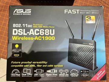 ASUS DSL-AC68U è un veloce modem ADSL / VDSL Wi-Fi router che grazie al trasferimento dati dual-band combinata fino a 1900 Mbps. 1300 Mbps 802.11ac a 5 GHz garantisce velocità di trasmissione dati wireless Gigabit, mentre la tecnologia Broadcom ® TurboQAM ™ 2.4 GHz 802.11n offre prestazioni da 450 Mbps a 600 Mbps con dispositivi compatibili. Compatibile con ADSL2/2+, ADSL, VDSL2, fibre e servizi via cavo.