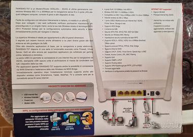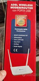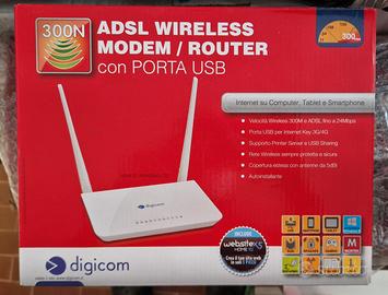 Modem router Digicom 300N con porta USB per internet key 3G/4G, velocità wireless 300M, velocità ADSL fino a 24 Mbps, antenne di trasmissione da 5dBi, autoinstallante.