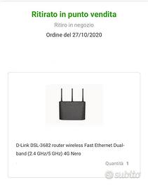 Vendo per passaggio a fibra, usato pochissimo, meno di un mese praticamente MAI, in condizioni impeccabili, come se fosse uscito dal negozio, perfettamente funzionante modem router DLINK AC750 dual band VDSL/ADSL modello DSL 3682 ancora in GARANZIA, cedo con scatola e tutti gli accessori originali, basta vedere le foto. Non esitate a contattarmi per avere altre foto o per info, possibilmente tramite whatsapp.