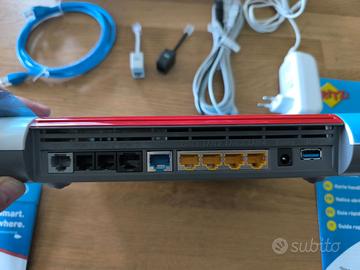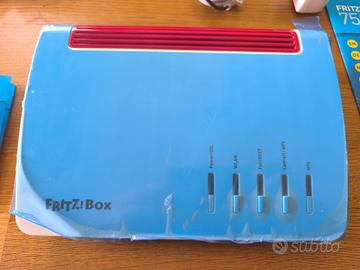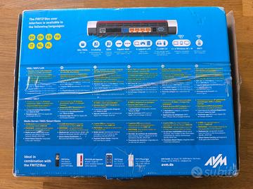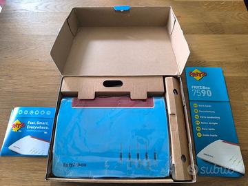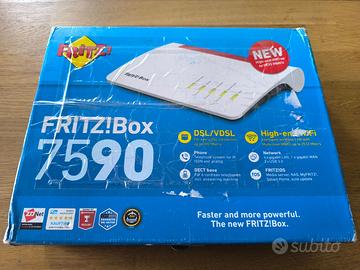 Splendido Modem Router Fritzbox 7590, uno dei migliori modem Fritz mai prodotti, perfetto per tutti i tipi di connessione e operatori internet fino alla fibra FTTH a 1Gbps. 1 porta WAN Gigabit e 4 porte LAN Gigabit. Gestisce telefoni fissi con due porte analogiche e radiotelefoni DECT direttamente, consentendo di dismettere la base radio. Gestisce direttamente dispositivi domotici Zigbee. Firmware 8.20. Scatola originali e dotazioni complete. Dispositivo perfetto, con ancora pellicola azzurra originale.