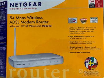 Vendo router NETGEAR DG834G ,come da foto. Tutto tenuto in perfette condizioni estetiche e funzionali. Con scatola completo di dispositivi ed accessori a 10 €.