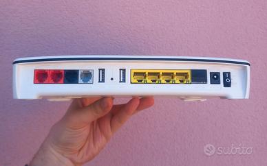 modem/router della Tim usato ma perfettamente funzionante (connettività: ADSL/ADSL 2+/VDSL); il modem opera solo con linea Telecom Italia/Tim; le porte presenti sono: 2 per il collegamento del telefono, 2 per il collegamento al filtro DSL, 2 porte USB, 4 porte Ethernet e 1 porta per la Fibra; NOTA BENE: manca tutta la cavetteria cosi come il cavo d'alimentazione e lo scatolo originale