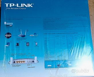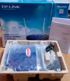 Modem Router Wireless TP Link 300Mbps Wireless N ADSL2+ Modem Router. Model No. TD-W8960N. All-in-One , Modem ADSL, router NAT Switch a 4 porte punto di accesso wireless in un unico dispositivo 300Mbps wireless Nuovo mai usato ancora nella sua confezione originale completo di cavi , alimentatore , Splitter ADSL , Manuale di guida e cd di installazione rapida.