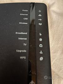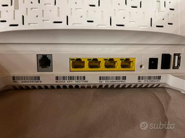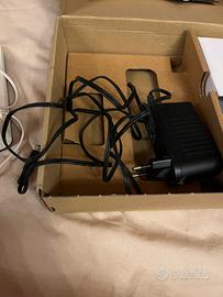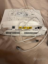 Modem Technicolor TG589vn v2 con alimentattore e cavo di rete nella sua confezione originale.
