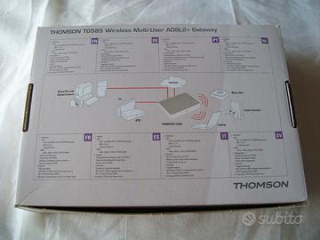 Thomson TG585v8 modem Adsl2+ perfettamente funzionante. Dispone di quattro porte Ethernet per la connessione diretta di personal computer o altro. È possibile anche sfruttare la connessione senza fili (Wi-Fi) in aggiunta a quella Ethernet. Apparecchio semplice ma affidabile, fornito da molti provider internet tra cui Tiscali e Infostrada.