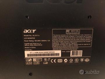 Vendo monitor di marca ACER 15 pollici formato 4:3 perfettamente funzionante usato molto poco + cavo di collegamento.