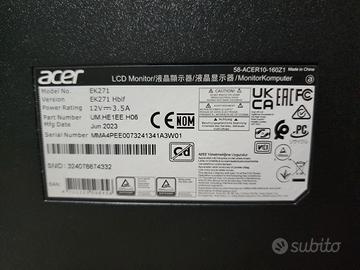 Vendo monitor Acer EK271Hbif da 27 pollici, risoluzione Full HD 1920x1080, frequenza di aggiornamento 100Hz, perfetto per lavoro, studio o intrattenimento.