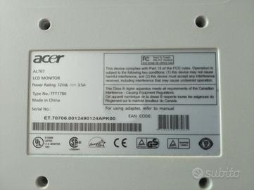 Monitor LCD Acer da 17'' con spina VGA, fuzionante ma con un difetto visivo (vedi foto). Alimentatore incluso, manuale non disponibile.