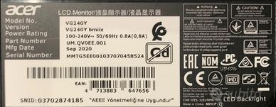 Monitor acer nitro gaming, FHD 1920x1080p, ips, 100hz, impianto audio dolby, 24”, 2xhdmi 1.4, vga in, 16:9, 1ms, 250 cd/m2, 99% (sRGB), 99% (Adobe RGB), 16,7 milioni di colori, 1000:1, Amd FreeSynk, 14kWh. PERFETTAMENTE FUNZIONANTE, mancano scatola e relativi manuali utente cartacei. Ritiro zona Moruzzo (Ud) no spedizione.