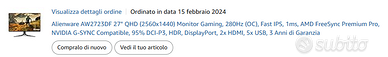 Vendo monitor Alienware 27" QHD (2560x1440) con refresh rate fino a 280Hz, pannello IPS di alta qualità, colori brillanti e tempo di risposta bassissimo: ideale per il gaming competitivo e uso professionale.