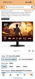 Vendo per mancato utilizzo, volevo usarlo in postazione con doppio monitor ma per esigenze personali non mi sono trovato bene. AOC Gaming Monitor Q27G42XE 27 pollici, 2560x1440, WQHD, 180Hz, Fast IPS Panel, 0.5ms MPRT, Speakers, (HDMI2x 2.0 DP 1x 1.4) Adaptive Sync, HDR10, G-Sync Compatible, Nero Usato neanche un mese, in garanzia ed imballato come nuovo. prezzo del nuovo 165€ vendo 110€, non trattabile