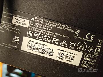 AOC AGON AG271QG Monitor Gaming da 27" IPS, QHD, 2560 x 1444, 165 Hz, Speaker, DP, HDMI, 4 Porte USB, G-Sync (vero , lato hardware), Nero, 27 pollici.