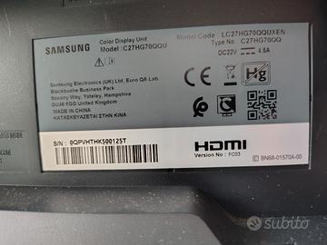 Vendo monitor gaming Samsung LC27HG70. come nuovo. Schermo curvo da 27" con raggio 1800R Risoluzione WQHD (2560x1440) HDR Refresh rate 144Hz e tempo di risposta 1ms Tecnologia Quantum Dot Compatibile FreeSync 2 Connettività: 2 porte HDMI, DisplayPort, uscita cuffie Base regolabile in altezza, inclinazione e rotazione fornito con imballo e accessori originali.