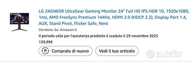 Monitor IPS da 24” con risoluzione Full HD (1920×1080), refresh rate a 144Hz e tempo di risposta 1ms, ideale per il gaming competitivo. Supporta HDR10 e AMD FreeSync Premium per un’esperienza fluida e senza tearing. Dotato di HDMI 2.0, DisplayPort 1.4 e uscita AUX. Stand regolabile con funzione pivot, tecnologia Flicker Safe. Colore nero, ottime condizioni, usato pochissimo. Senza scatola originale.