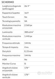 Vendo SOLO Monitor da gaming Samsung schermo curvo 27" 144hz. Caratteristiche tecniche nelle foto.