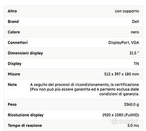 Monitor Dell da 22 pollici, risoluzione 1920 x 1080 (FullHD), ingressi DisplayPort/VGA, completo di cavi. Perfettamente testato e funzionante.