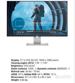 Monitor DELL S2715H da 27 pollici, un display versatile ed elegante, ideale per lo smart working, lo studio e l'intrattenimento multimediale. Il monitor è in ottimo stato, come visibile dalle foto, ed è stato testato per garantirne il perfetto funzionamento. La scheda tecnica nelle foto. PREZZO TRATTABILE. PREFERISCO LA CONSEGNA A MANO IN PROVINCIA DI SALERNO MA VALUTO ANCHE SPEDIZIONE ALTROVE.