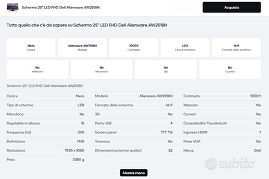 Vendo esclusivamente per inutilizzo Monitor Gaming Dell Alienware 25 pollici LED FHD 240 hz - AW2518H perfettamente funzionante e in ottime condizioni, porte HDMI e Displayport. Scatola mancante. No spedizione, consegna a mano.