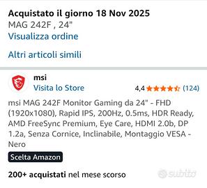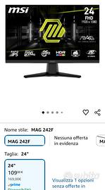 vendo per inutilizzo monitor msi MAG 242F Monitor Gaming da 24" - FHD (1920x1080), Rapid IPS, 200Hz, 0.5ms, HDR Ready, AMD FreeSync Premium, Eye Care, HDMI 2.0b, DP 1.2a, Senza Cornice, Inclinabile, Montaggio VESA - Nero. preferibilmente consegna a mano.