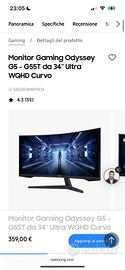 Vendo monitor Samsung Odyssey G534 ultra WQHD curvo (modello G55T) acquistato a maggio 2025, usato pochissimo e in condizione pari al nuovo. Nessun graffio, pixel bruciato o difettato è perfetto e funziona al 100%.