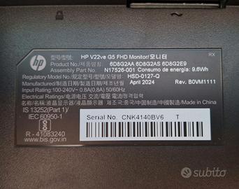 Vendo monitor HP modello V22ve G5 da 22 pollici. Il monitor è in ottime condizioni estetiche e funzionali, tenuto con cura. È una soluzione ideale per ufficio, studio e gaming, grazie al pannello VA antiriflesso con risoluzione Full HD (1920x1080) in formato 16:9. Offre immagini fluide grazie alla frequenza di aggiornamento di 75Hz, al tempo di risposta di 5 ms e al supporto per la tecnologia AMD FreeSync. Le caratteristiche principali sono: schermo 22" FHD Antiriflesso (Pannello VA), refresh rate: 75Hz, tempo di risposta di 5 ms, tecnologia AMD FreeSync, luminosità di 200 Nits, modalità Low Blue Light per ridurre l'affaticamento visivo, 1 porta HDMI 1.4, 1 porta VGA, reclinabile e predisposto per attacco VESA standard 10x10 cm. Vendo con scatola originale. Prezzo trattabile. A disposizione per ulteriori informazioni o foto aggiuntive.