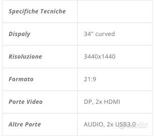 Specifiche Tecniche Dispaly 34" curved Risoluzione 3440×1440 Formato 21:9 Porte Video DP, 2x HDMI Altre Porte AUDIO, 2x USB3.0