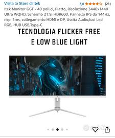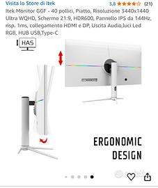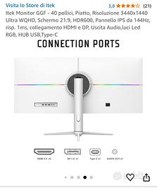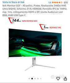 Itek Monitor GGF - 40 pollici, Piatto, Risoluzione 3440x1440 Ultra WQHD, Schermo 21:9, HDR600, Pannello IPS da 144Hz, risp. 1ms, collegamento HDMI e DP, Uscita Audio,luci Led RGB, HUB USB,Type-C (per altre informazioni contattatemi in privato)