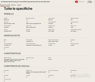 Vendo per passaggio a OLED, in condizioni impeccabili con ancora le plastiche laterali di protezione Monitor LG 27GP850 2K UltraGear Gaming a 180 HZ compreso della sua scatola.