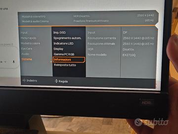 Vendo BenQ MOBIUZ EX2710Q in condizioni perfette,circa 1 anno di vita. Monitor top di gamma per gaming e film, monta pannello LG di alta qualità. Risoluzione: 2K QHD (2560x1440) Refresh Rate: 165Hz (fluidità massima) Pannello: IPS con colori fedeli (95% DCI-P3) Tecnologia HDRi: Ottimizzazione intelligente dei colori e del contrasto in base alla luce ambientale. Audio: Casse treVolo 2.1 integrate con subwoofer (suono ottimo) Stato: Perfetto, no pixel morti, completo di cavi. Compreso di scatola originale