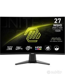 Vendo monitor MSI MAG 27CQ6F da 27 pollici curvo con risoluzione QHD (2560x1440), refresh rate fino a 180Hz e tempo di risposta di 0,5 ms (GtG).[msi +2] Ideale per gaming competitivo e uso quotidiano: ottima fluidità, immagini fluide e colori pieni, grazie al pannello Rapid VA curvo 1500R e al supporto Adaptive‑Sync / FreeSync.[msi +2] Caratteristiche principali: •27” curvo 1500R, risoluzione WQHD 2560×1440 •Fino a 180 Hz via DisplayPort, 144 Hz via HDMI •Pannello Rapid VA con 0,5 ms GtG •Supporto FreeSync / Adaptive‑Sync per immagini senza strappi •Ingressi: 1× DisplayPort 1.4, 2× HDMI 2.0b Condizioni eccellenti, nessun pixel bruciato o graffio. Completo di scatola originale