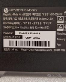 HP - PC V22 Monitor per PC, Schermo 22 Pollici Full HD, Risoluzione 1920 x 1080, 60 Hz, Micro-Edge, Antiriflesso, Tempo di Risposta 5 ms, Comandi sullo Schermo, HDMI e VGA, Reclinabile, Nero.