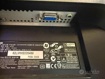 Vendo monitor per PC marca ASUS, modello VK191S, schermo LCD da 19 pollici. Il monitor è in buone condizioni estetiche e perfettamente funzionante, ideale per uso ufficio, studio o come secondo schermo. Dotato di ingresso VGA (D-SUB) e ingresso audio. Qualità ASUS affidabile, semplice da installare e utilizzare. Caratteristiche principali: •Schermo: 19” LCD •Modello: VK191S •Risoluzione: standard per la categoria •Ingressi: VGA (D-SUB), Audio In •Alimentazione: 100-240V Condizioni: Usato, funzionante al 100% Prezzo: 25 euro Consegna a brevi mano a Torino e dintorni.