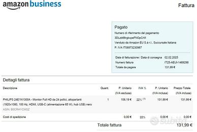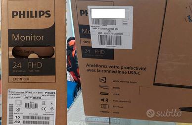 Monitor PHILIPS 24E1N1300AM, FHD da 24 pollici, Altezza regolabile, altoparlanti stereo, 1920x1080, frequenza aggiornamento immagini 100 Hz, HDMI hub USB connettore USB-C, completo di cavo alimentazione, cavo HDMI, come NUOVO (acquistato febbraio 2025), perfettamente funzionante sia video, sia audio, usato poco tempo e sostituito da monitor di dimensione superiore per necessità operative. Ritiro in zona