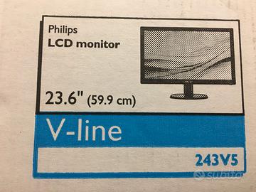 Vendo Monitor Philips LCD 24" in ottime condizioni Il Monitor è senza graffi e poco utilizzato Caratteristiche: •Display 16:9 Full HD 1920 x 1080 •Dimensioni pannello: 59,9 cm (23,6") •Ingresso segnale: VGA (analogico), DVI-D e HDMI (digitale) •Modello 243V5LHSB con SmartControl Lite •Cavo video HDMI o DVI compreso A disposizione per offerte ed informazioni in merito