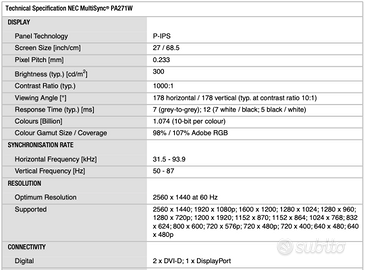 Vendo monitor professionale NEC MultiSync PA271W da 27" Wide Gamut compreso di palpebra opzionale. Il monitor é calibrabile tramite sonda esterna (non fornita), specifiche mostrate nella foto allegata, connettività 2 x DVI-D, 1 x DisplayPort, dotazione di serie, no imballo. Il monitor é in perfette condizioni estetiche e funzionali. Solo consegna a mano a Milano zona Crescenzago. Prezzo non trattabile.