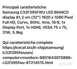 Vendo Monitor Samsung curvo 32 pollici, Bianco; modello C32F395FWU Full HD. Immacolato e complto di accessori e scatola originale.