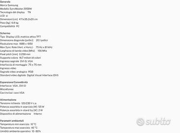 Monitor 20pollici usato ma in buone condizioni. Altezza regolabile.Ingresso VGA + DVI. Cavo alimentazione. Cavo VGA