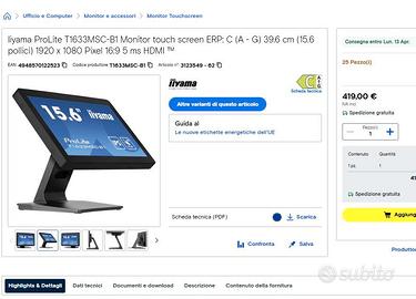 Monitor touch screen 15,6 pollici usato (poco) e perfetto Iiyama ProLite T1633MSC-B1 Monitor touch screen ERP: C (A - G) 39.6 cm (15.6 pollici) 1920 x 1080 Pixel 16:9 5 ms HDMI