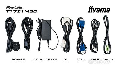 Vendo monitor touchscreen NUOVO, mai utilizzato, ancora sigillato nella sua scatola originale, marca iiyama, modello ProLite T1721MSC, 17'' pollici, touch, 1 ingresso DVI e 1 ingresso VGA, 2 uscite altoparlanti, 1 uscita mini jack, con supporto originale.